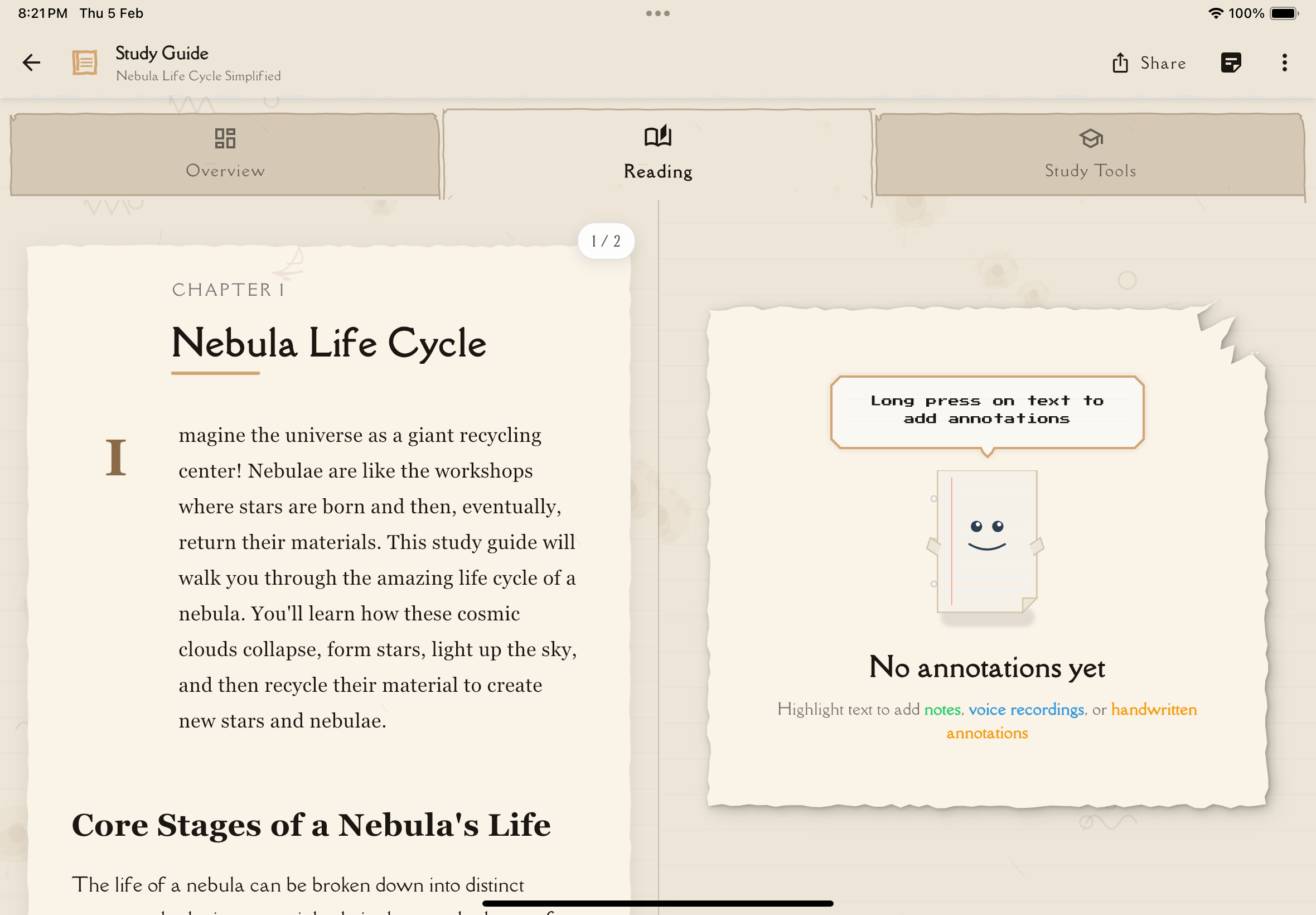 Annotations appear directly in the Reading tab of your study guide, allowing you to see your insights, explanations, and thoughts right alongside the content they reference. This contextual approach helps you understand concepts better by linking your annotations to specific passages.