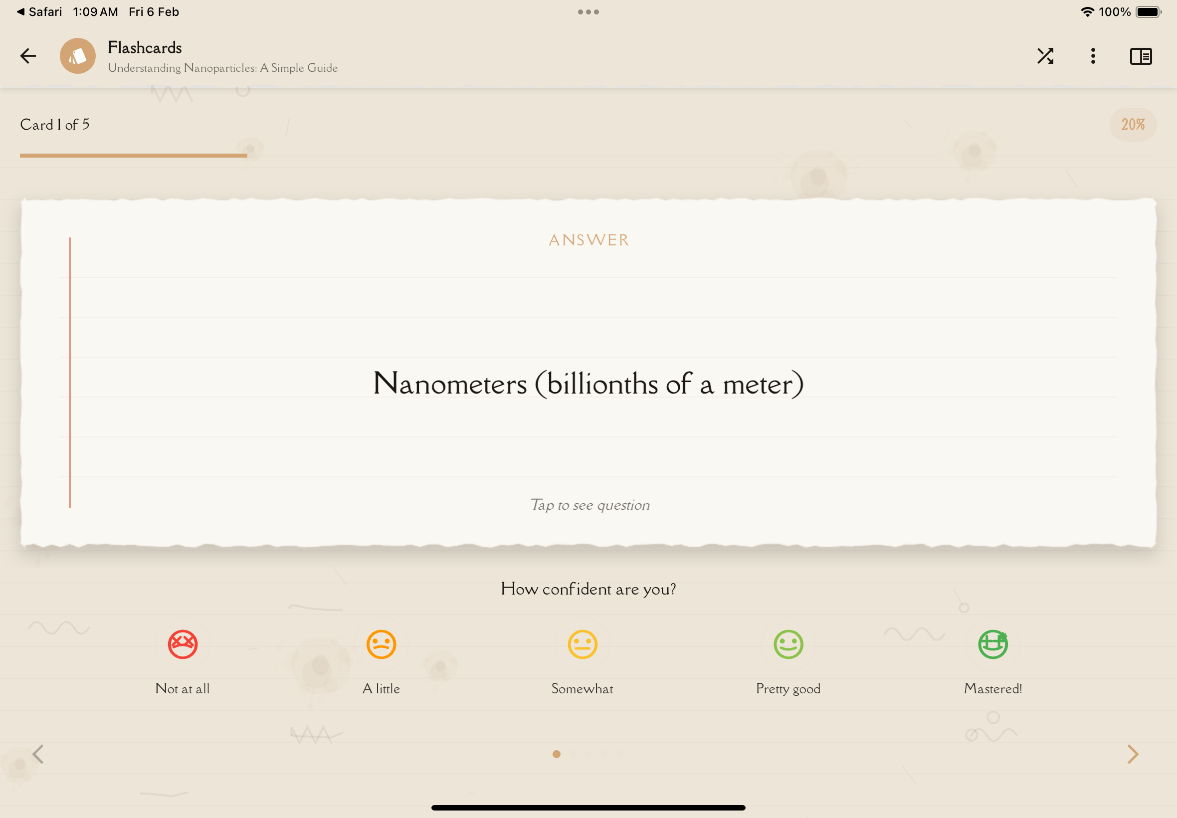 Spaced repetition scheduling updates automatically for each card based on your confidence ratings โ cards you struggled with will appear sooner in your next session.