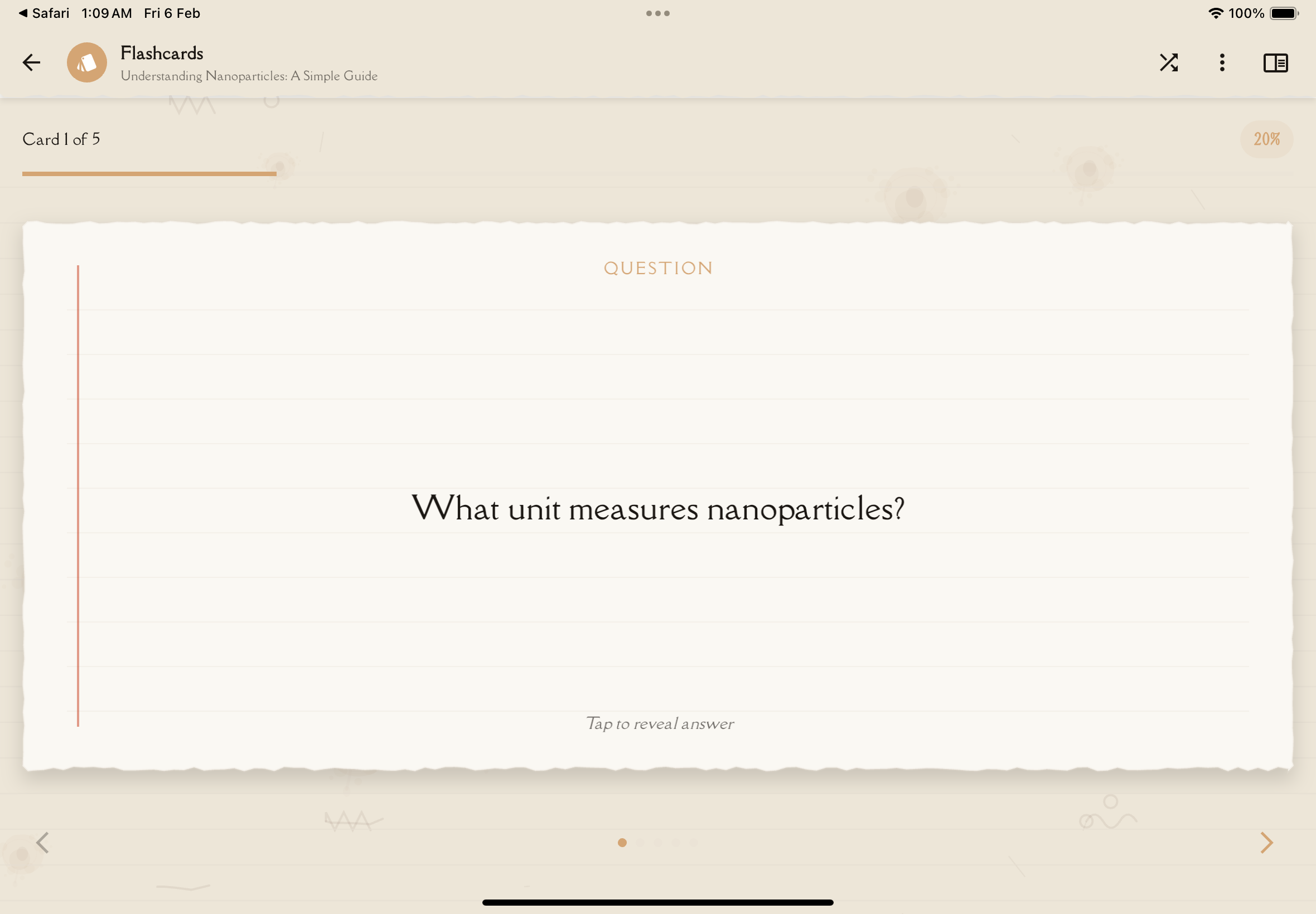 Use the previous and next arrows at the bottom to move between cards. Dot indicators show your current position in the deck.
