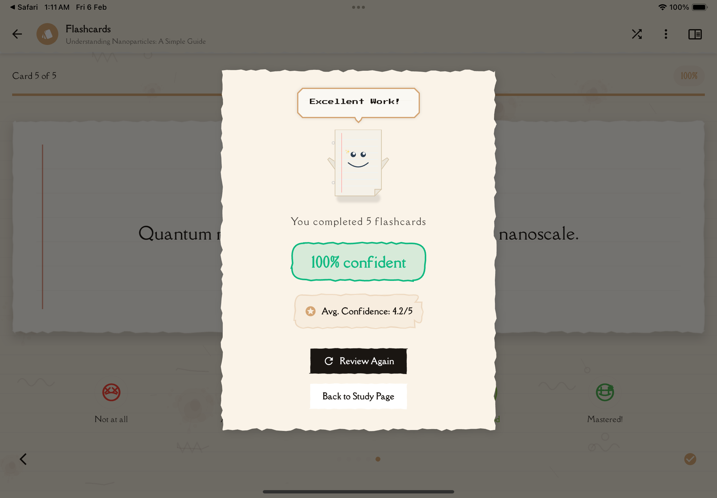 If your average confidence is low, that's a signal to revisit your study note. You might need to deepen your understanding before flashcard practice will be effective.