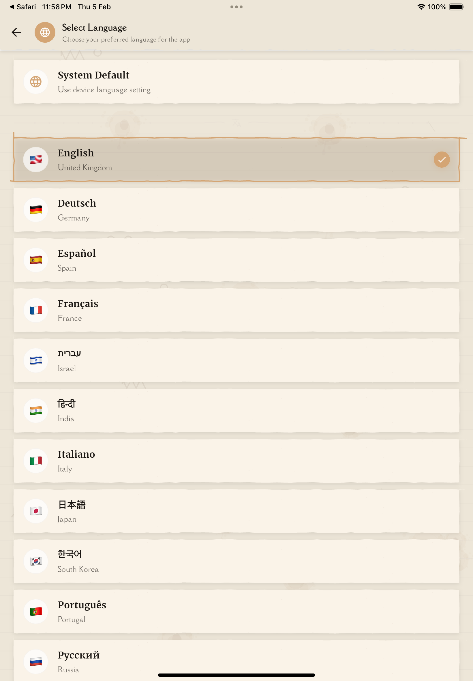 - System Default (follows device language)