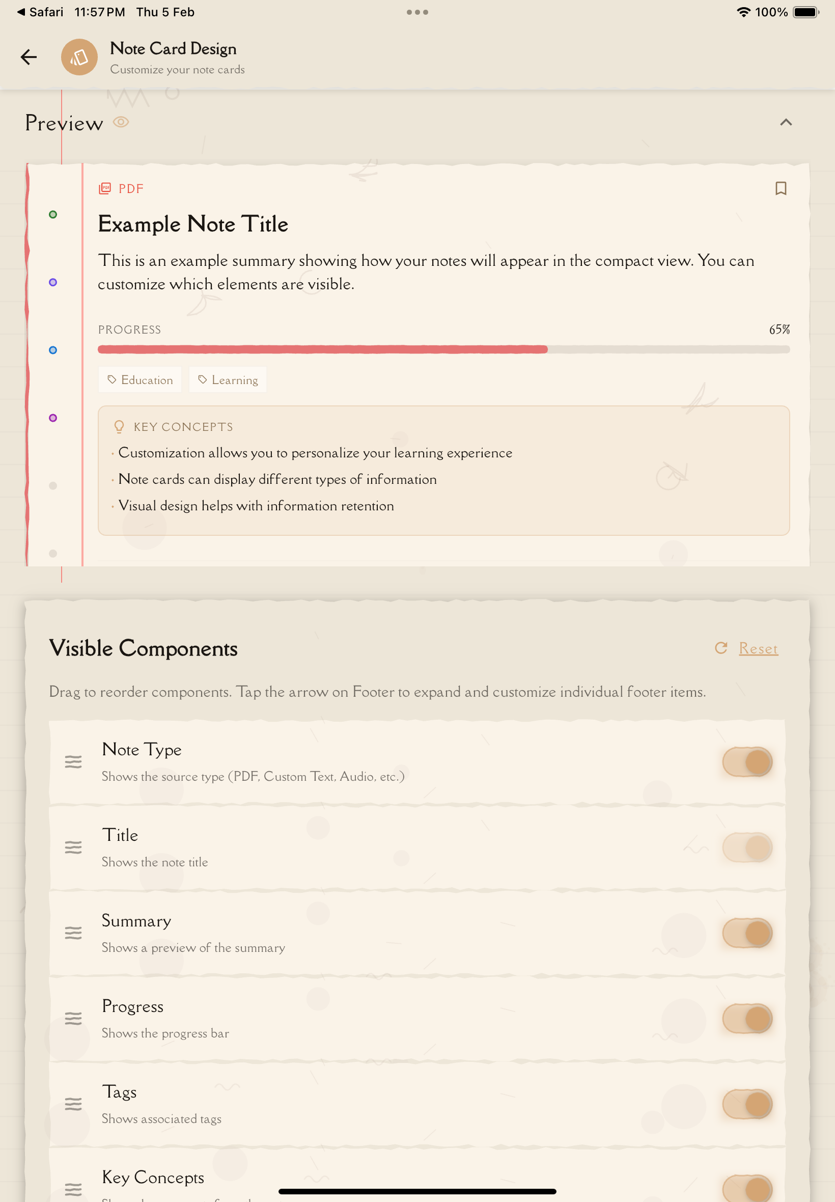 - Drag body components โ Note Type, Summary, Progress, Tags, and Key Concepts can be reordered within the body of the card