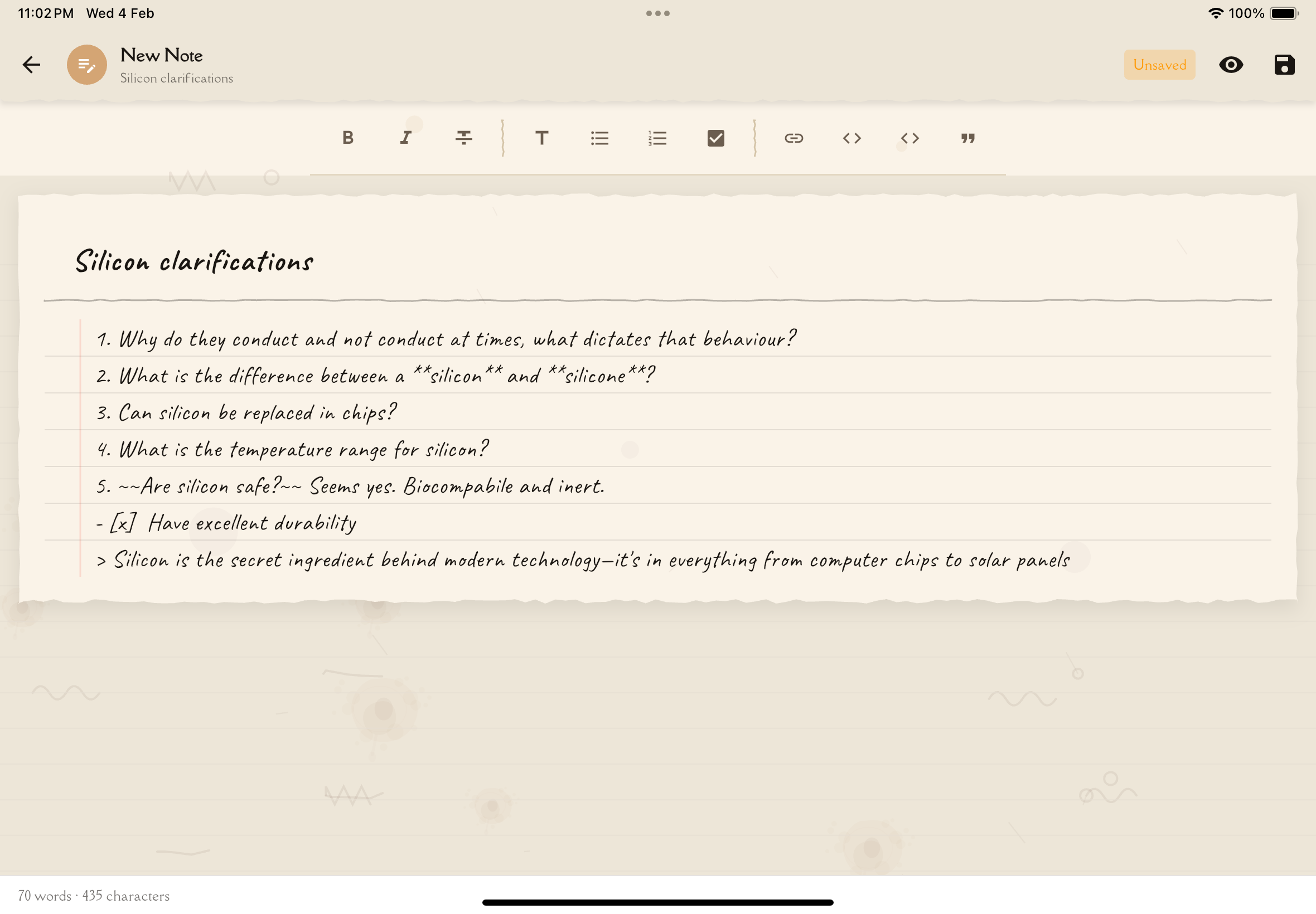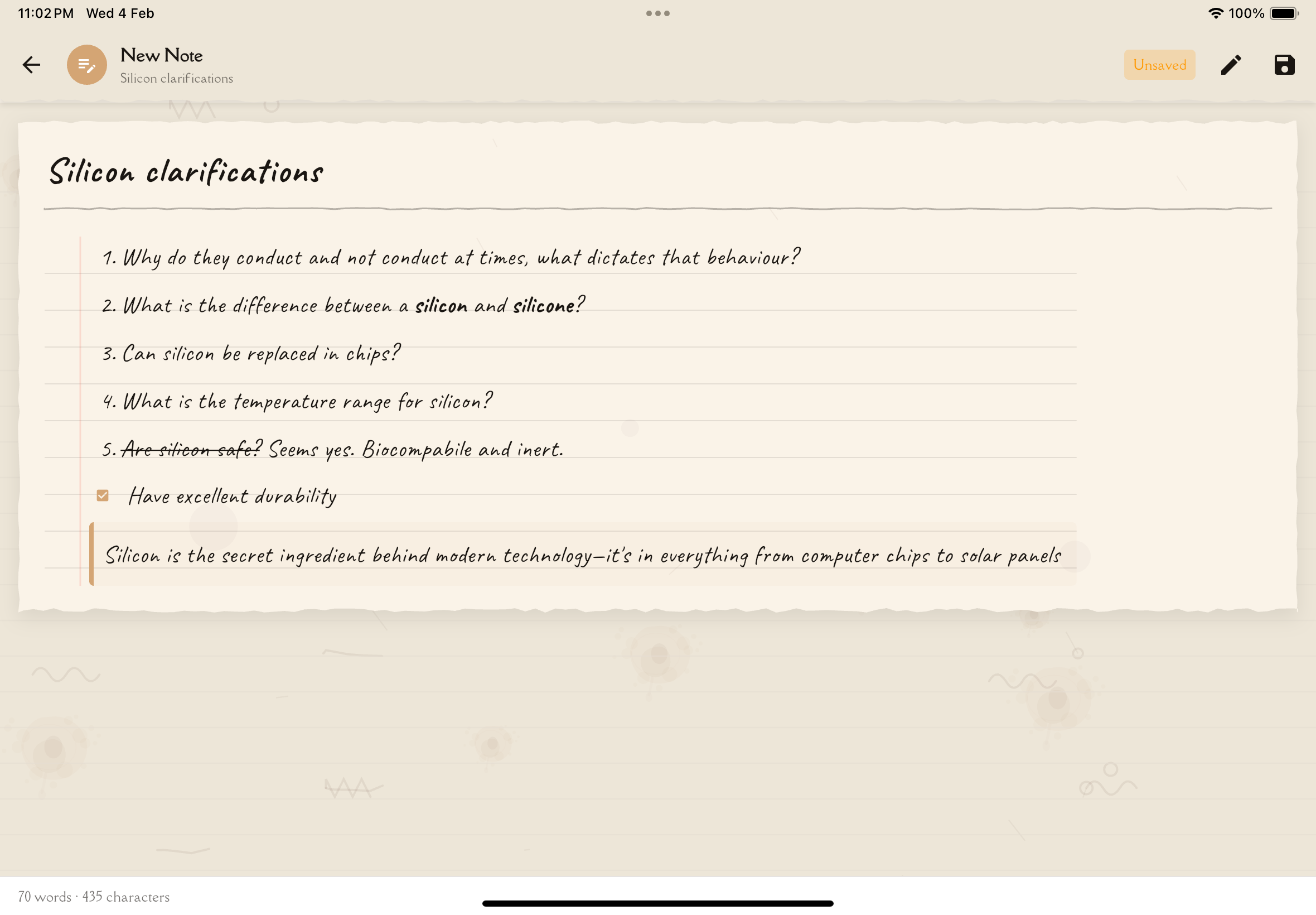 The typed note editor lets you write detailed explanations, examples, questions, and insights in your own words. It's perfect for practicing the Feynman Technique by transforming complex concepts into simple, clear language.