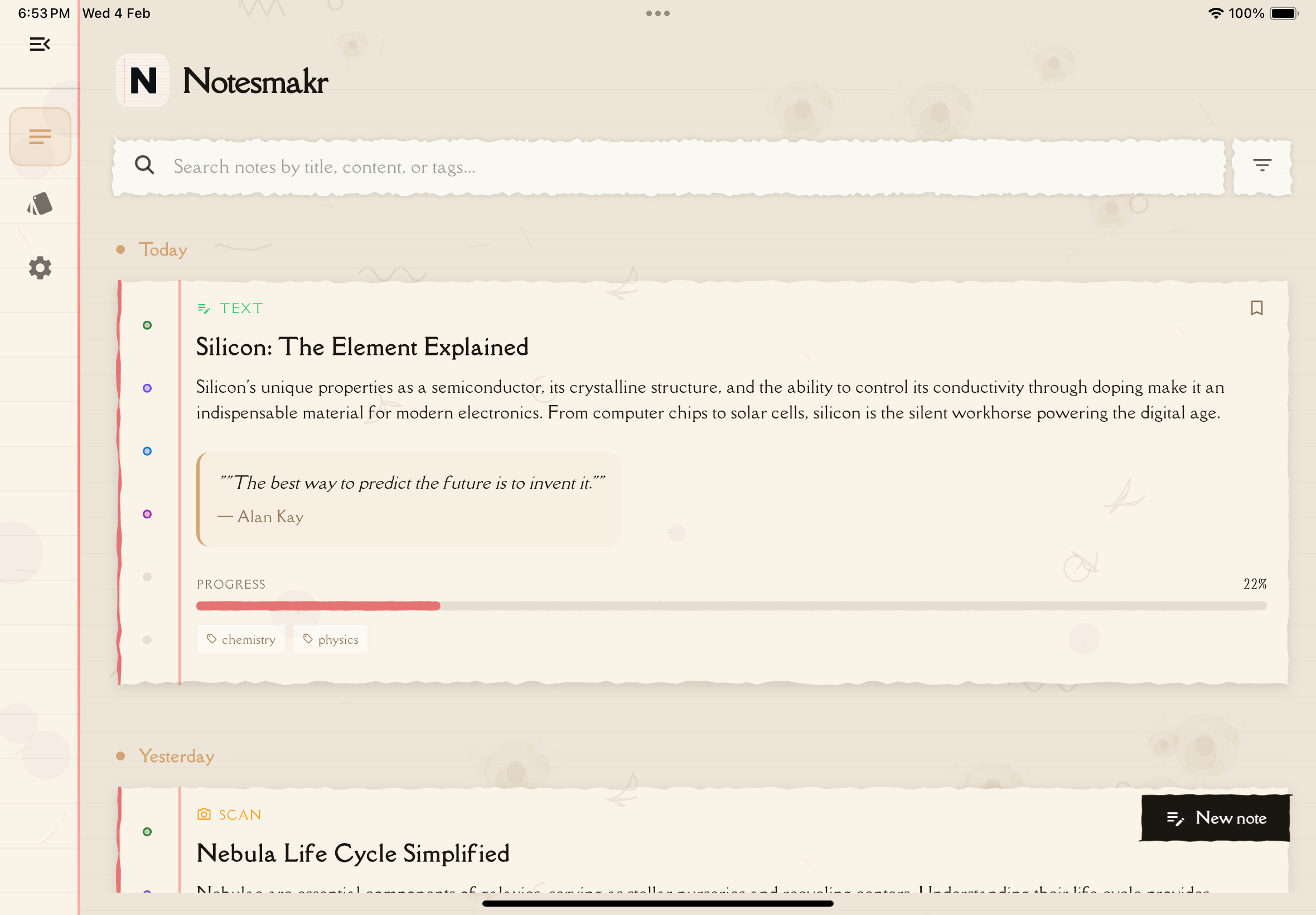Notesmakr is your personal study companion that transforms complex learning materials into simplified, easy-to-understand notes. Whether you're studying from textbooks, podcasts, or lecture notes, Notesmakr helps you break down difficult concepts and test your understanding.