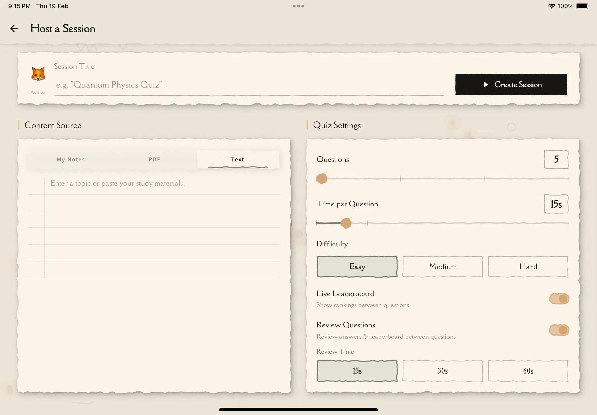 Give your session a descriptive name (e.g., "Biology Chapter 5 Review" or "History Final Prep").