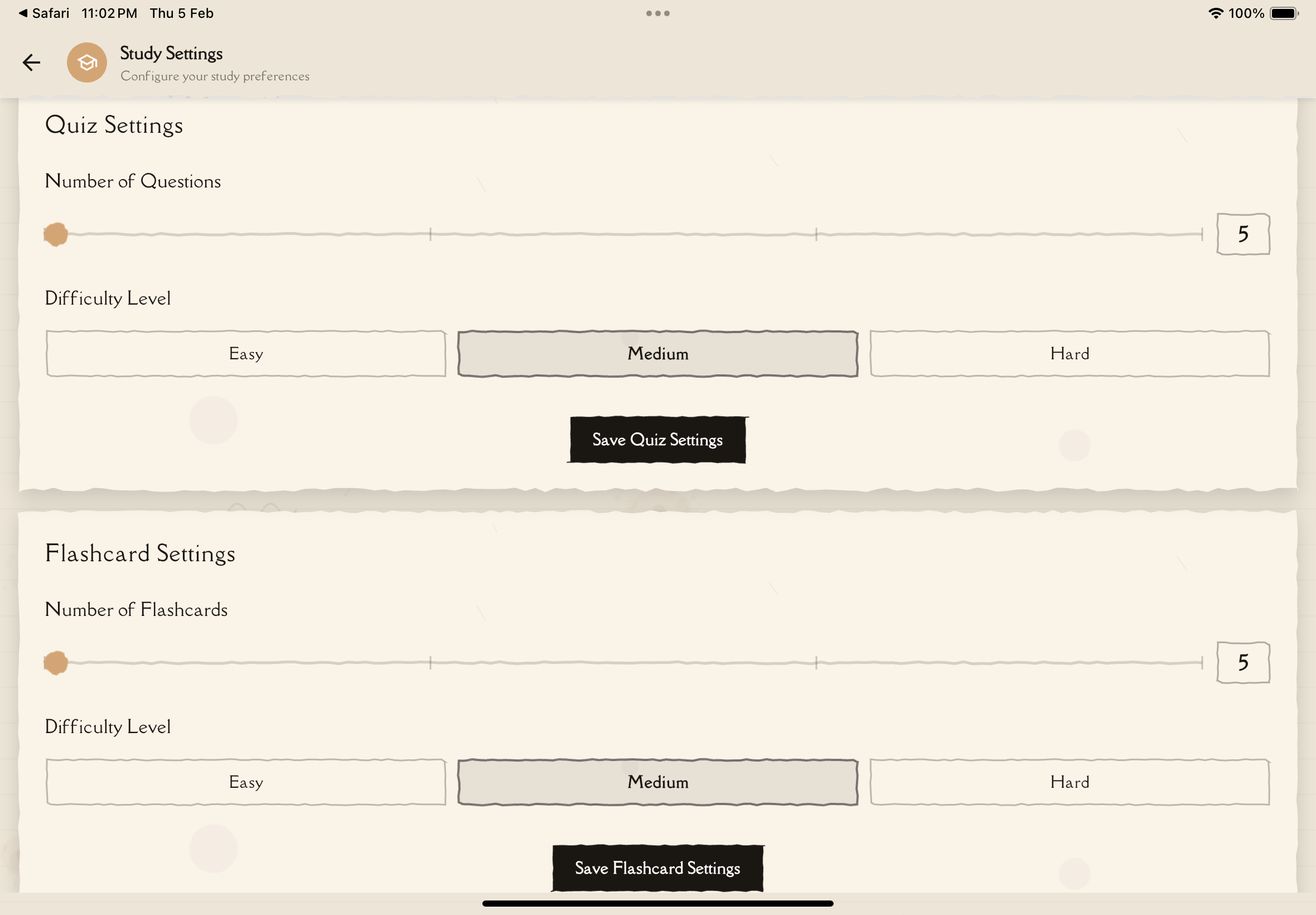 - Future quiz and flashcard generations use your new defaults